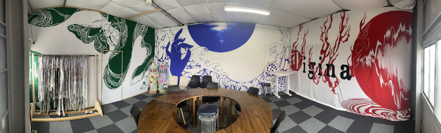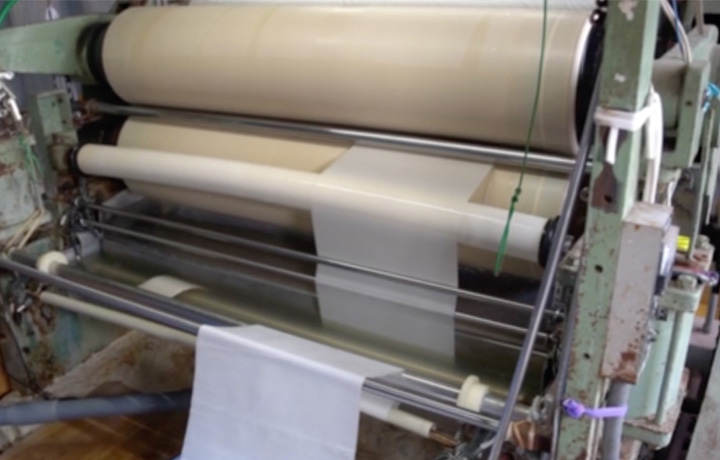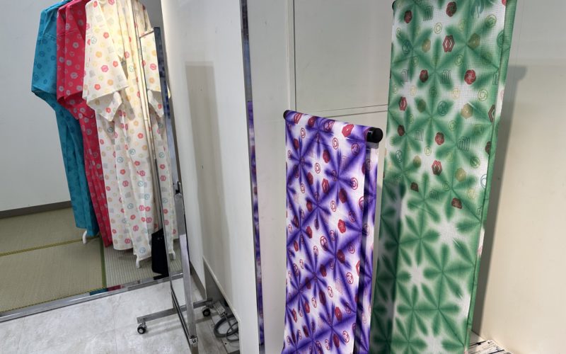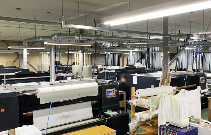 染工場で、一般的な大型プリンターは価格が5〜8千万円、デジナのプリンターは500万円、プリント速度は遅いが、ハイエンド機が対応できない極小ロットプリント(1〜20m)が可能。