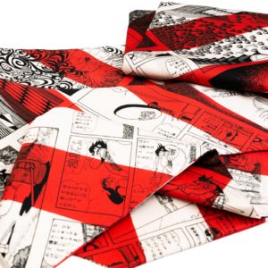 ■ 染料ならではの「深み」と「風合い」 顔料プリントとは異なり、繊維の奥までインクを浸透させる染料プリントは、生地本来の柔らかい風合いを損ないません。着物特有の美しいドレープを保ちつつ、火の鳥の象徴である「赤」を鮮烈に、そして漫画のコマの「黒」を深く沈み込ませることで、メリハリのある極上の仕上がりを実現しました。